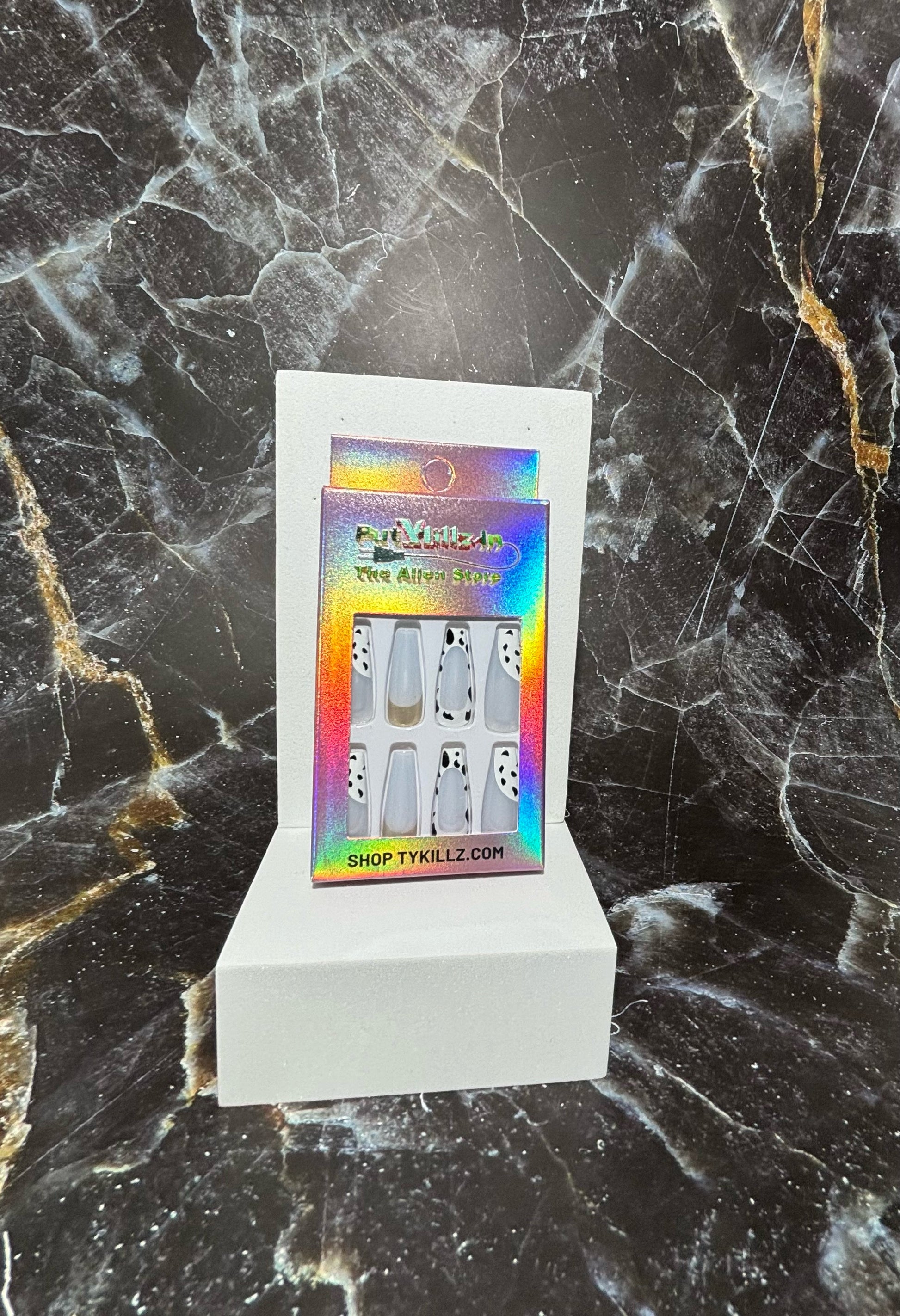 Dalmatian press-on nails feature a chic and playful design inspired by the iconic spotted pattern. With a sleek, monochrome look, these nails add a trendy yet timeless touch to any style. Easy to apply and remove, they offer a stylish, salon-quality manicure in minutes